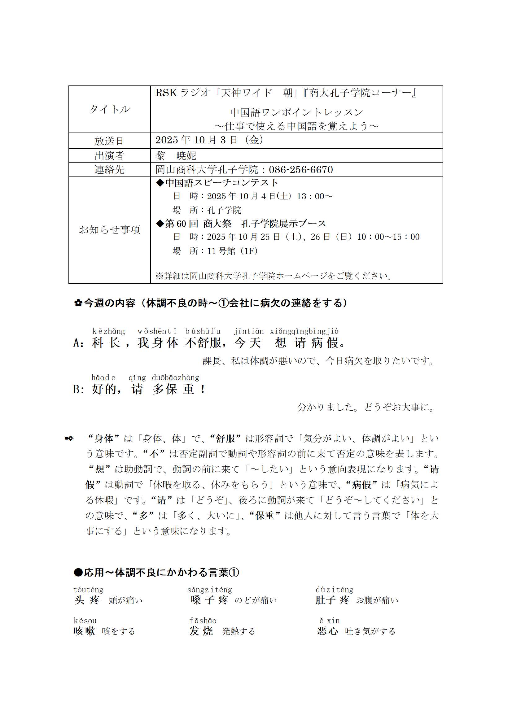 8:50〜RSKラジオ「天神ワイド 朝」『商大孔子学院コーナー』中国語ワンポイントレッスン