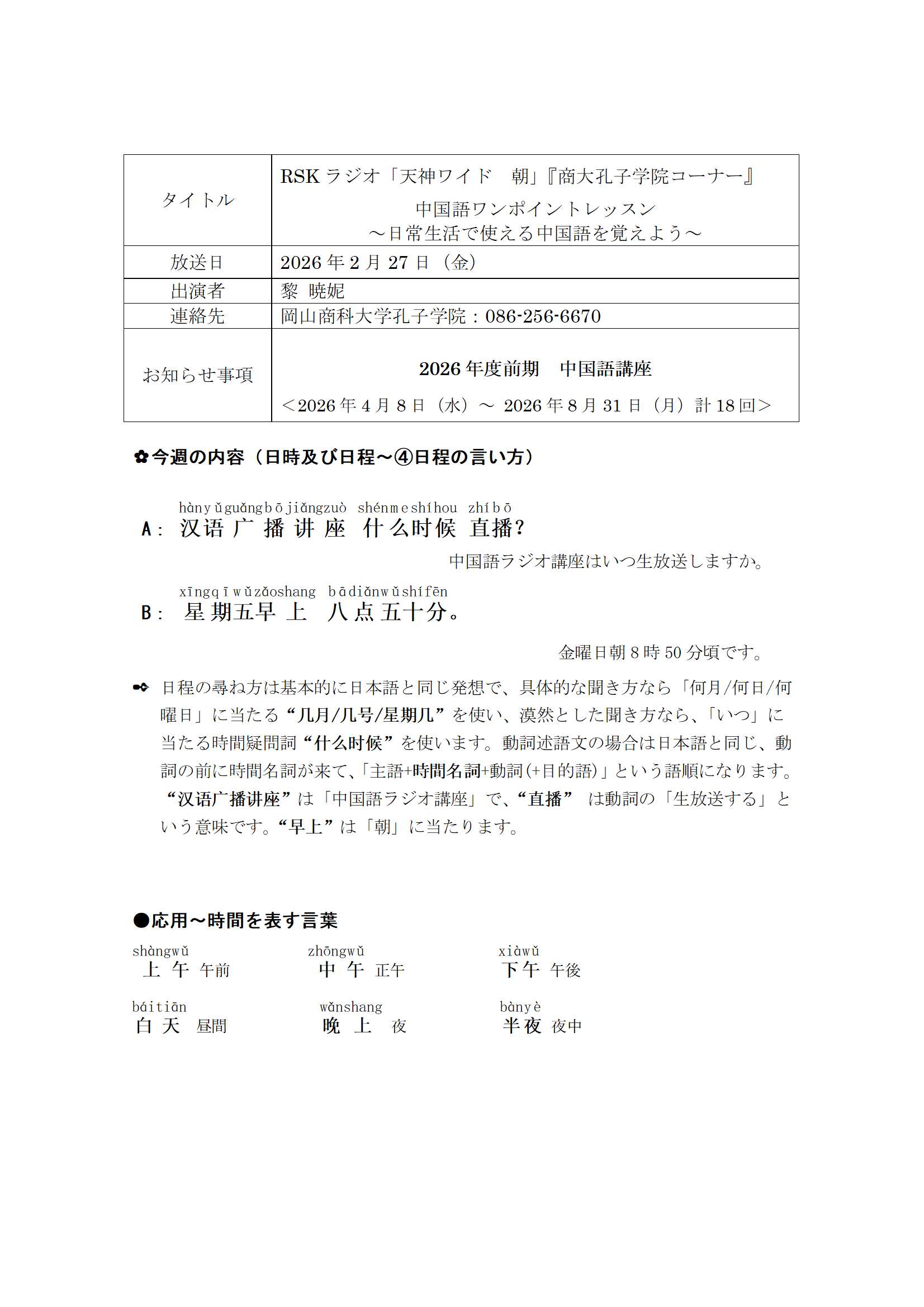 RSKラジオ「天神ワイド 朝」『商大孔子学院コーナー』中国語ワンポイントレッスン