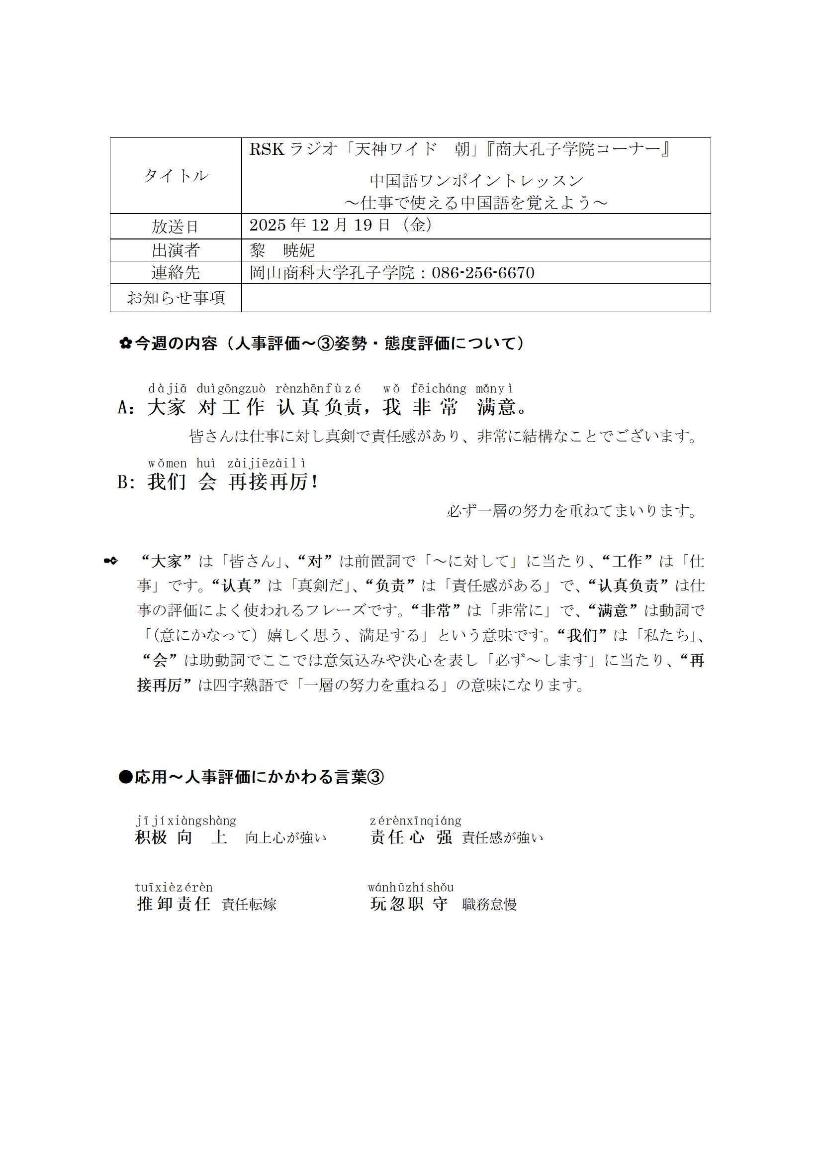 RSKラジオ「天神ワイド 朝」『商大孔子学院コーナー』中国語ワンポイントレッスン