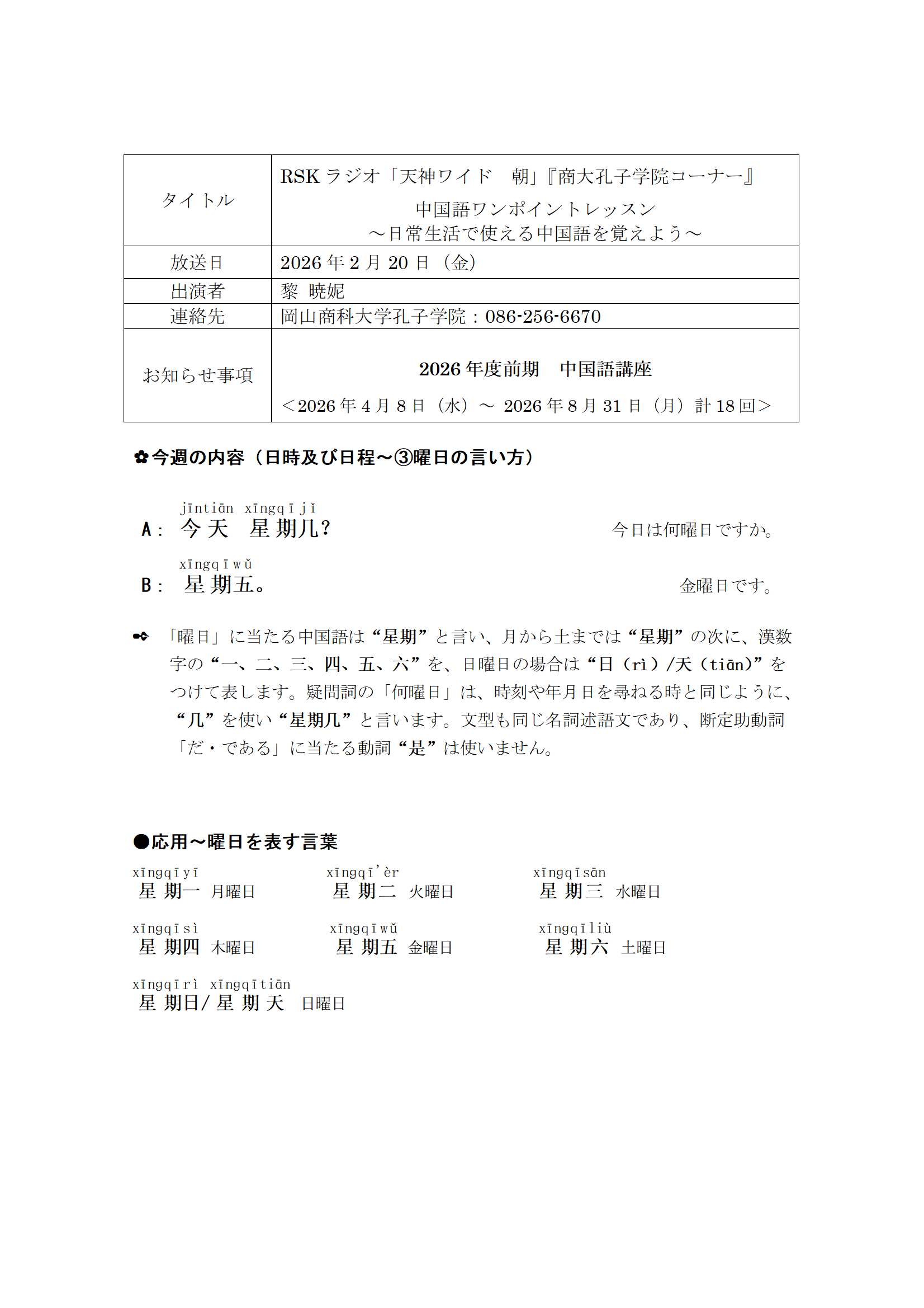 RSKラジオ「天神ワイド 朝」『商大孔子学院コーナー』中国語ワンポイントレッスン